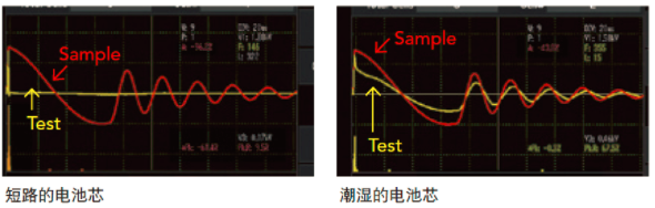 諧振波形中的第一個(gè)電壓峰值。當(dāng)電池芯正負(fù)極板之間的絕緣不良或是隔離膜不存在時(shí),在足夠的電場(chǎng)強(qiáng)度/電壓下會(huì)造成放電,會(huì)導(dǎo)致第一個(gè)電壓峰值比樣品的第一個(gè)電壓峰值低。