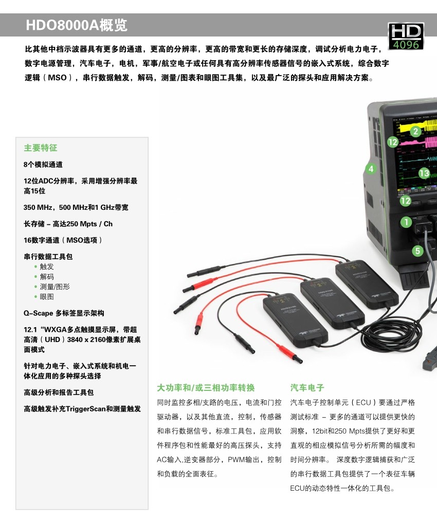 HDO8000示波器提供8個模擬輸入通道,采用力科HD4096高分辨率技術,有著高達12-bit的垂直分辨率,且帶寬高達1GHz,是用于調試三相電力電子,汽車電子和機電系統的理想工具。