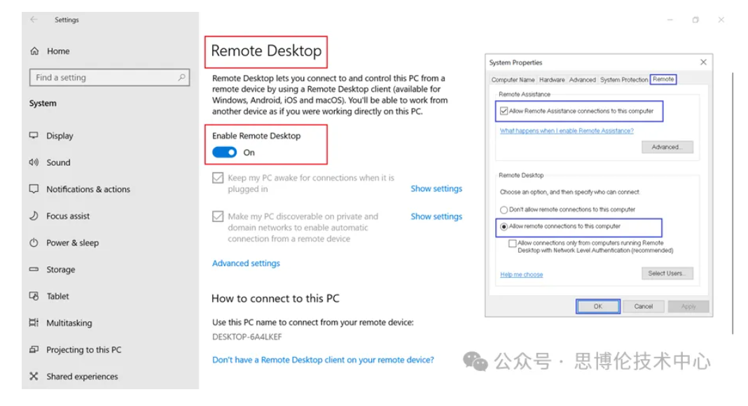 右擊This PC,選擇Properties,然后選擇Remote,勾選”Allow Remote Assistance connections to computer”和“Allow remote connections to this PC”, 點OK。