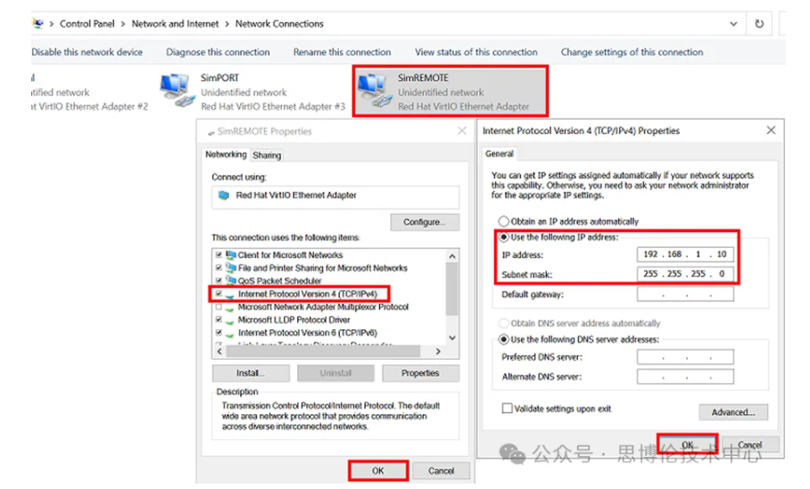 在搜索框輸入View network connections并打開,右擊SimREMOTE,選擇Properties,然后是Internet protocol version 4,設置Use the following IP address,比如設為192.168.1.10,然后點OK。