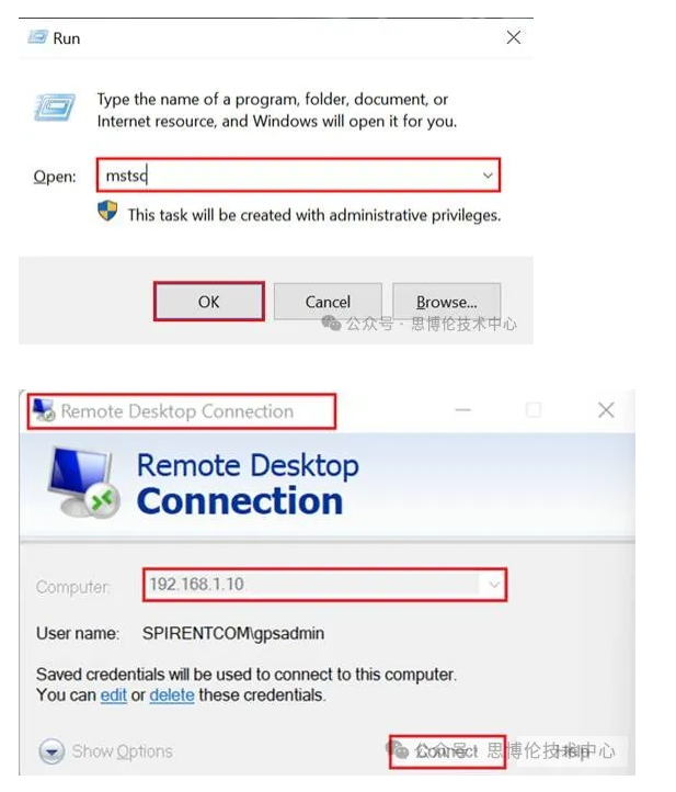 在Win10系統下使用“WIN+R”組合鍵快捷打開運行對話框,然后輸入“mstsc”,點確定;輸入GSS7000剛才設置的IP 地址:192.168.1.10,賬戶名:gpsadmin,密碼:admin。進入后便可和本地電腦直接進行復制粘貼等文件傳輸操作。